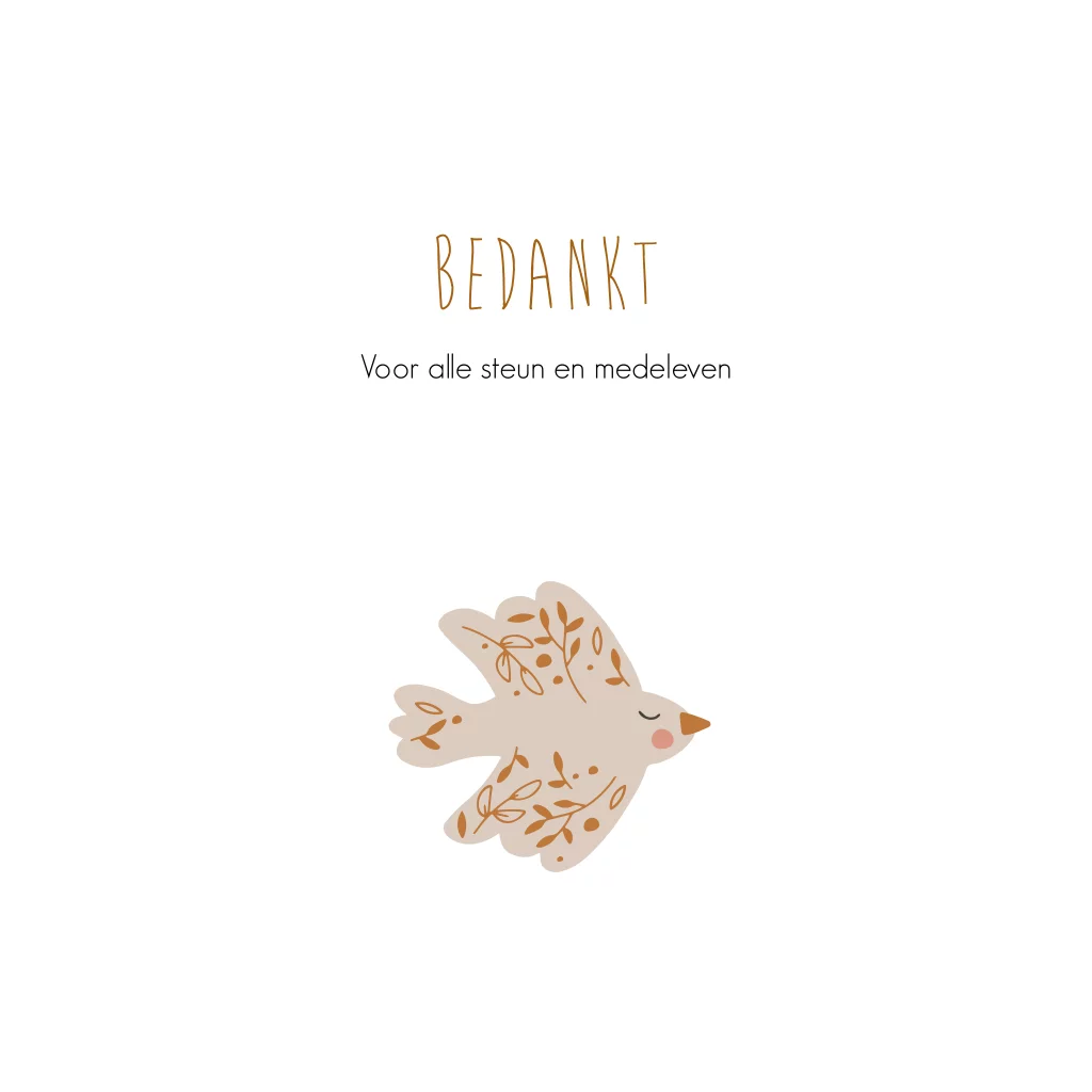 Bedankkaart met een lief vogeltje op de voorzijde. Een bedankt kaart voor het overlijden van een baby of kind. Op de binnenzijde is er ruimte voor een foto van jullie kindje.