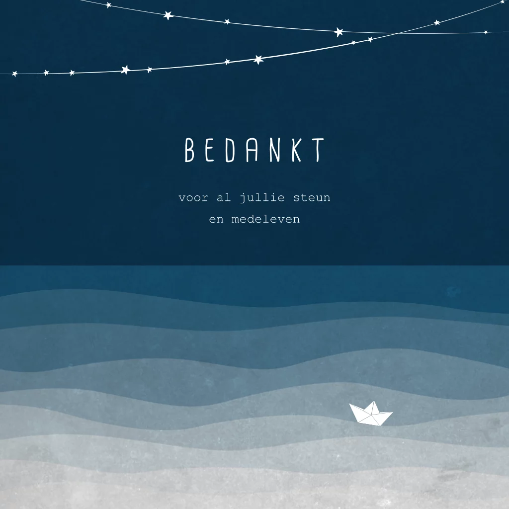 Bedankkaart met een klein papieren bootje, drijvend op de golven van de zee. In de lucht een sterrenslinger. Op de binnenzijde is er ruimte voor een foto van jullie kindje.