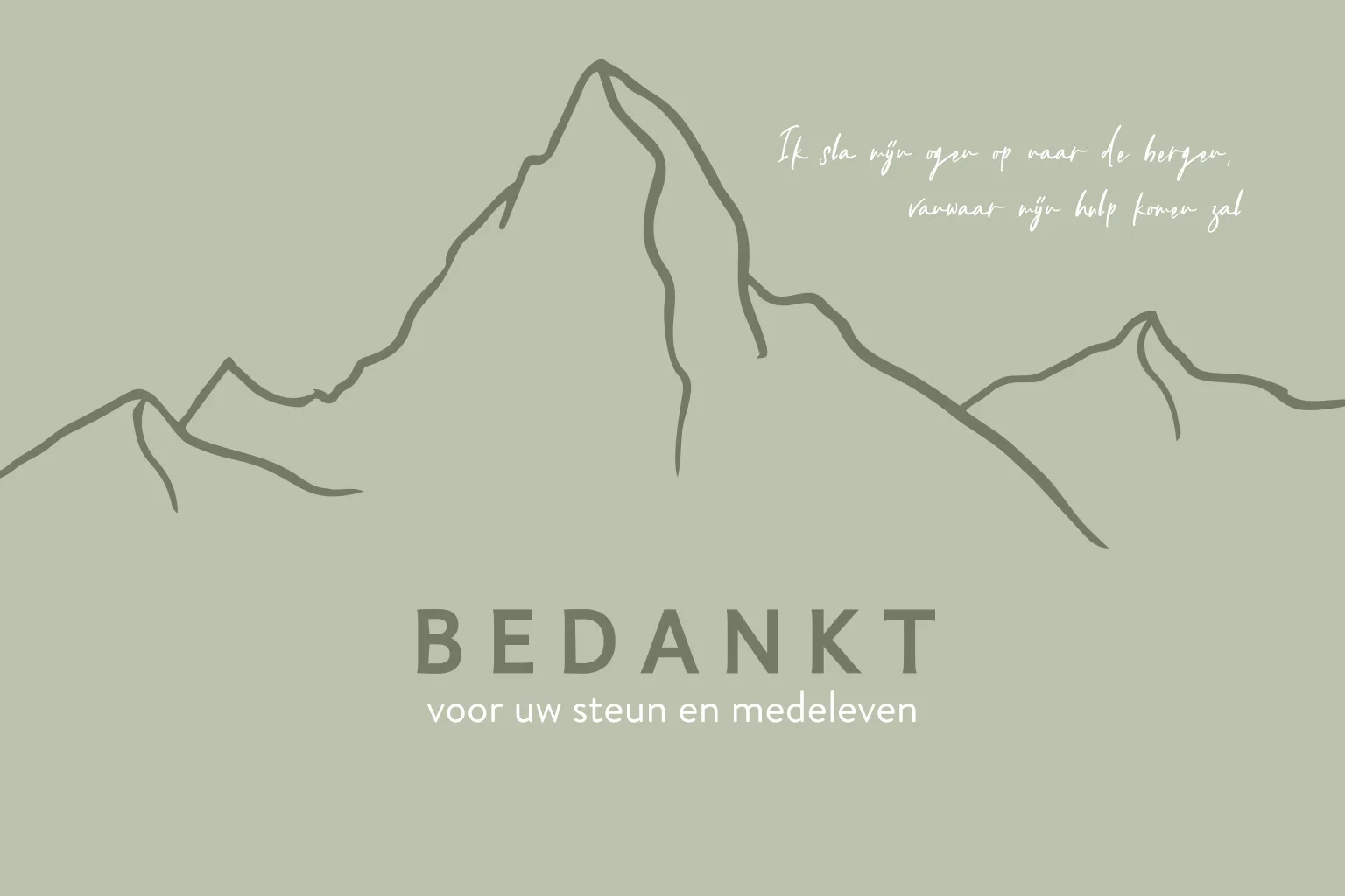 Deze bedankkaart na overlijden past bij de serie 'Psalm 121'. De kaart heeft een illustratie van een berg, wat past bij de woorden: Ik sla mijn ogen op naar de bergen, vanwaar mijn hulp komen zal.