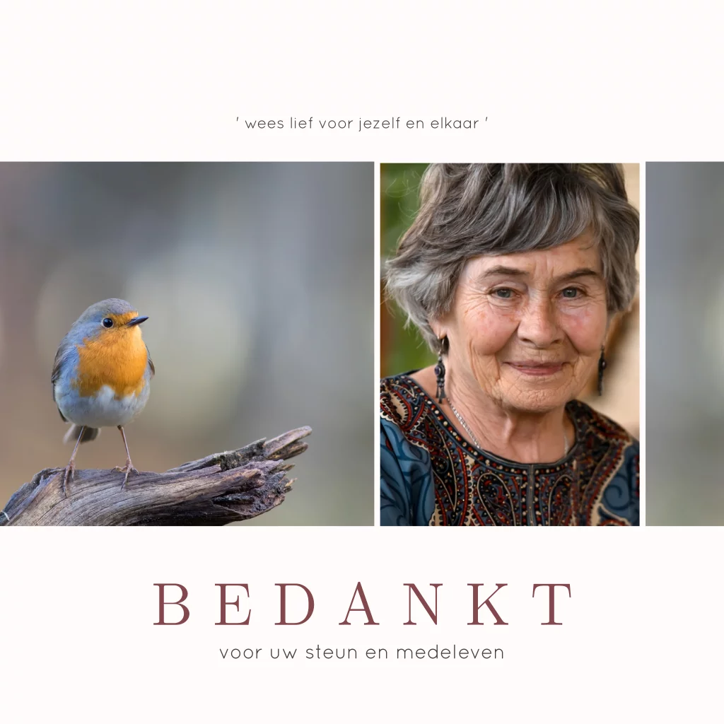 Bedankkaart met vlakken met een eigen foto en een sfeerfoto van een roodborstje op een takje.