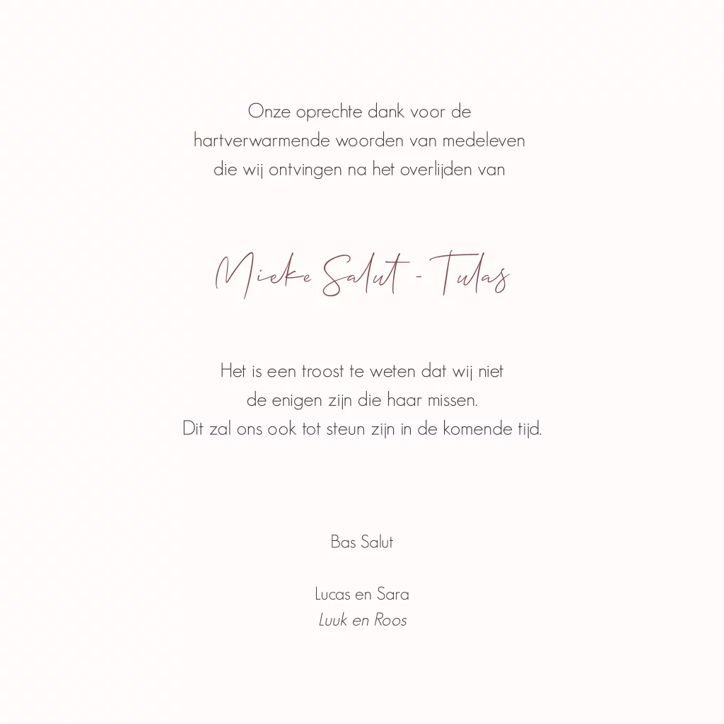 Met een bedankkaart kun je familieleden en vrienden bedanken voor alle steun na het overlijden van jullie dierbare.