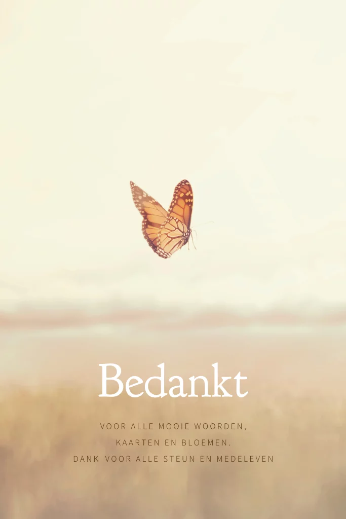 Rouw bedankkaart met een mooie aquarel achtergrond en vlinder. Deze bedankkaart voor overlijden heeft een rustige uitstraling.