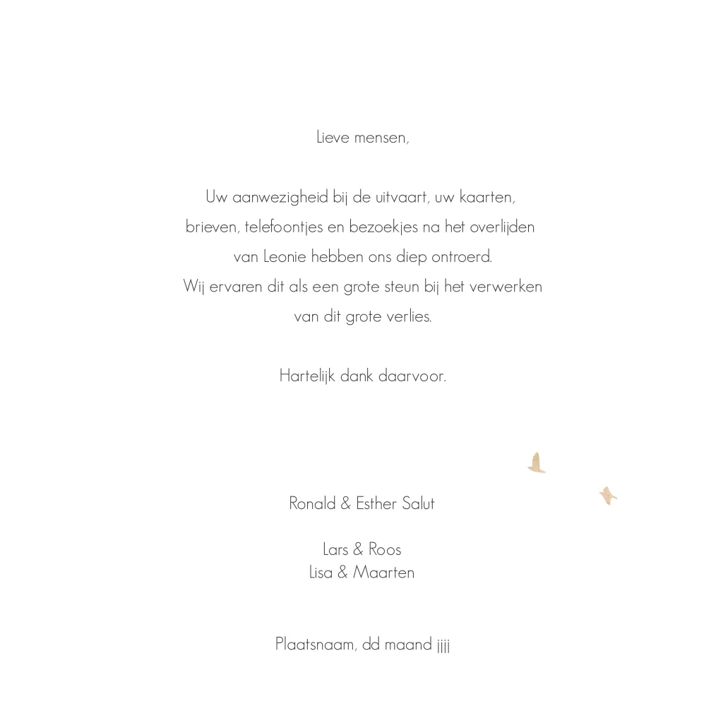 Met een dankbetuiging kun je familieleden en vrienden bedanken voor alle steun na het overlijden van jullie dierbare.