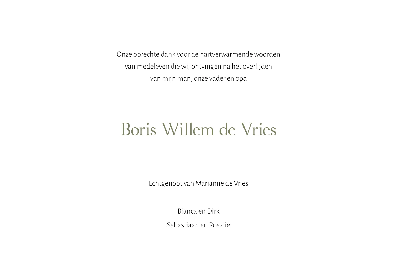 Bedankt kaart voor het overlijden. Met een aquarel illustratie van bergen, bomen en een meer.