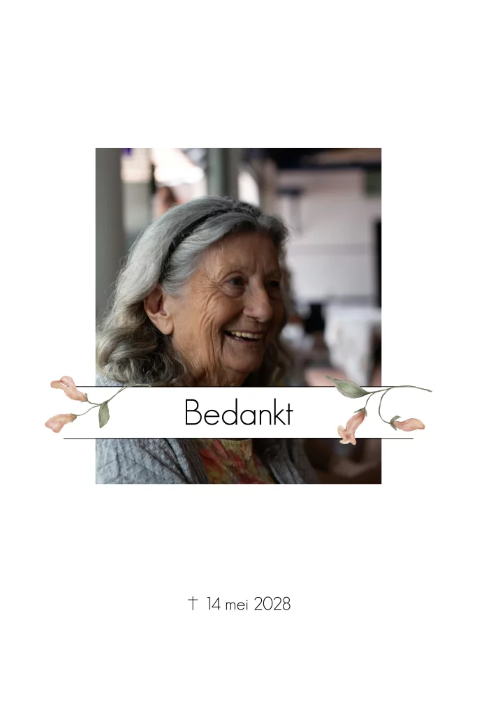 Mooie bedankt kaart voor het overlijden van een vrouw. De kaart heeft een romantisch design met roze bloemen en de mogelijkheid om voorop een eigen foto te uploaden.