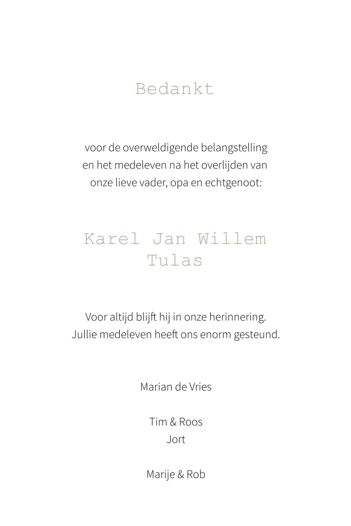Met een dankbetuiging kun je familieleden en vrienden bedanken voor alle steun na het overlijden van jullie dierbare.