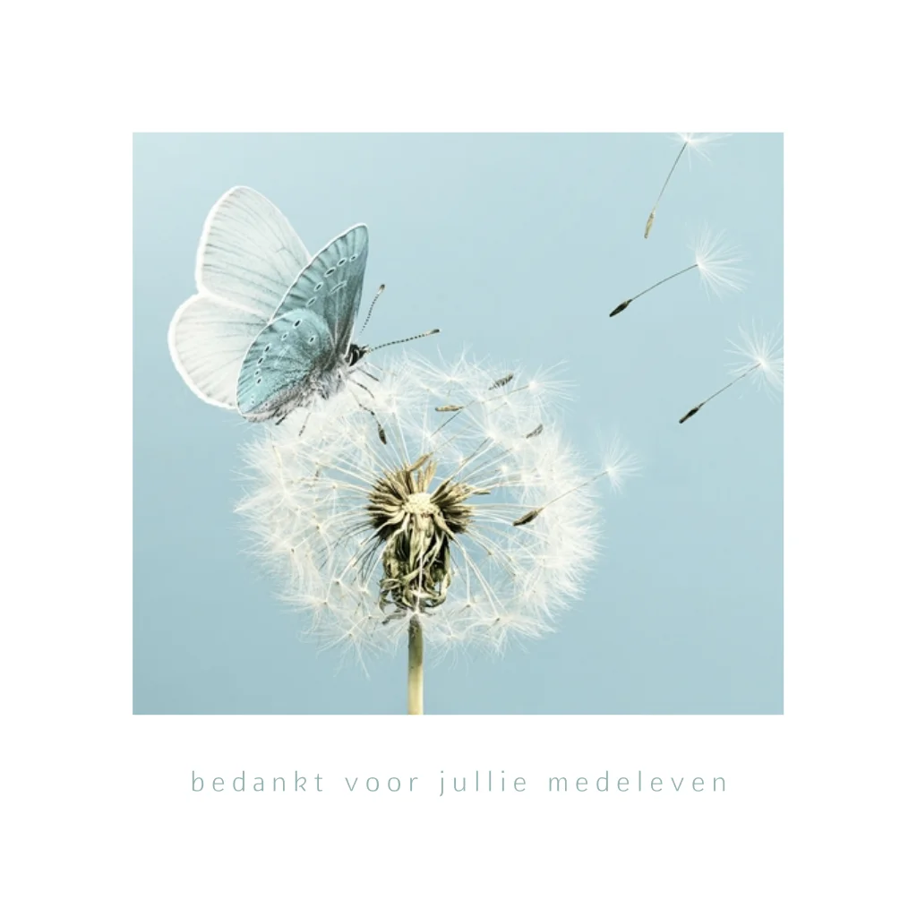 Dankbetuiging na overlijden met een sfeerfoto van een paardebloem met pluisjes waarop een vlinder vliegt. Aan de binnenkant van deze kaart staat een foto van de overleden dierbare. Deze kun je gemakkelijk vervangen of verwijderen.