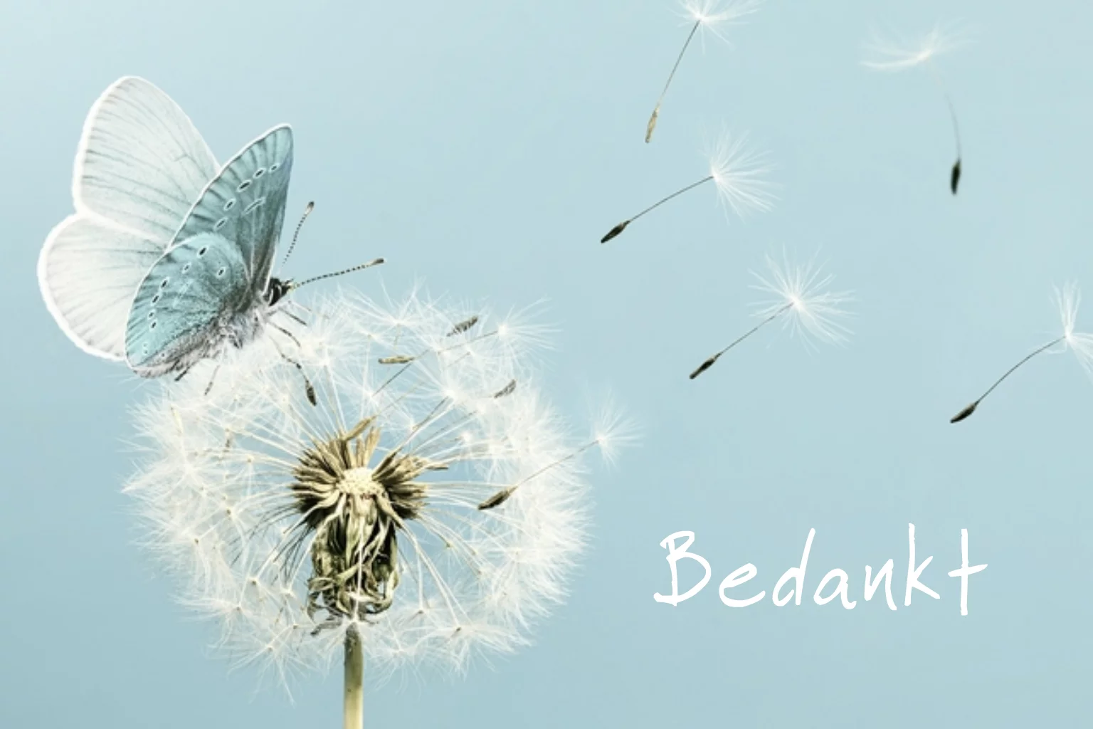 Bedankkaart met een sfeerfoto van een paardebloem met pluisjes en een vlinder.