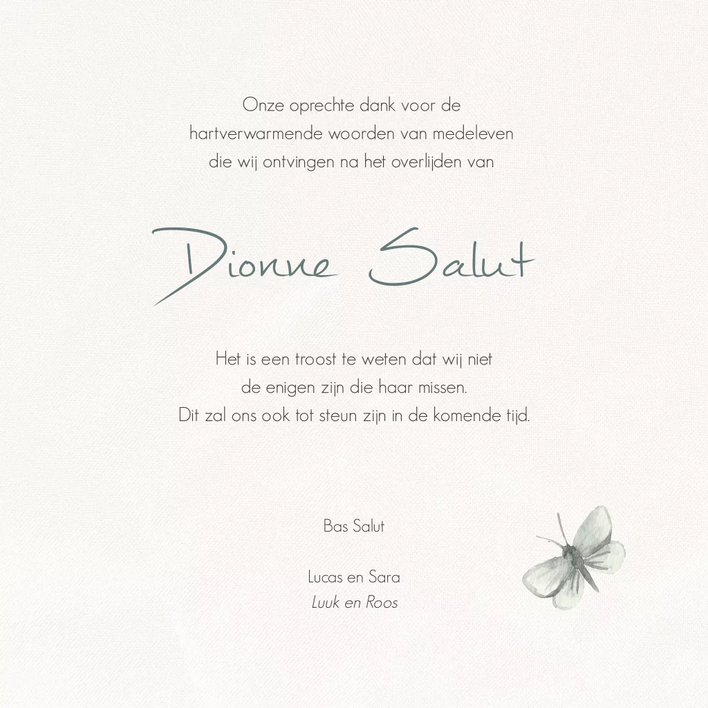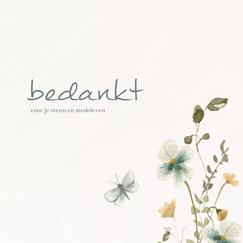 Bedankkaart overlijden met veldbloemen en een vlinder. De blauwe tinten van de bloemen en de vlinder op deze kaart zijn verfijnd. Aan de binnenkant van deze kaart kun je eenvoudig een foto plaatsen. Wil je geen foto in de kaart dan kun je deze gemakkelijk verwijderen.