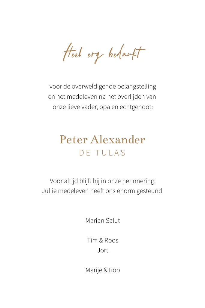 Met een dankbetuiging kun je familieleden en vrienden bedanken voor alle steun na het overlijden van jullie dierbare.