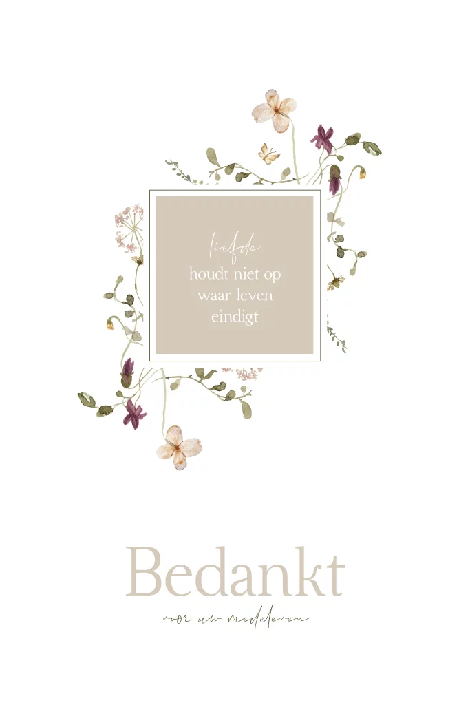 Rouw bedankkaart met mooie geschilderde aquarel veldbloemen. Deze bedankkaart voor overlijden heeft een klassieke uitstraling door de witte achtergrond en de geschilderde bloemen om het beige kader heen. Zet in het kader een mooie quote of tekst.