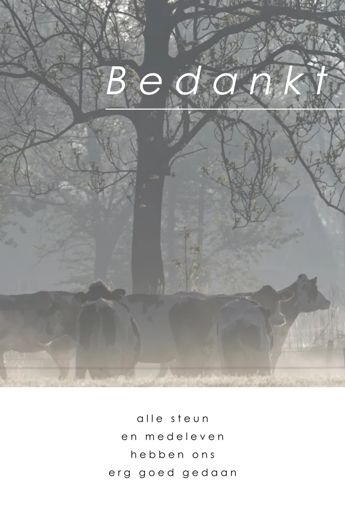 Bedankkaart met sfeerfoto van een landschap met koeien. De foto's op de voor- en binnenzijde kun je in de editor gemakkelijk vervangen voor een eigen foto.