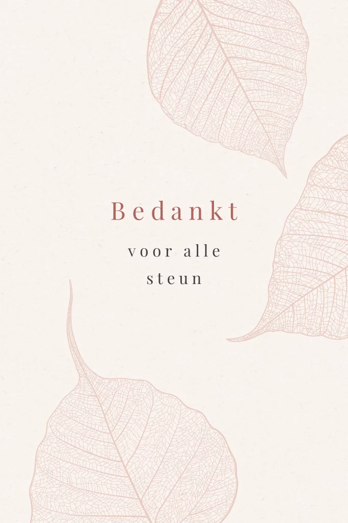 Dankbetuiging na overlijden in een lichte, oud roze kleur met op de achtergrond gedroogde bladeren.