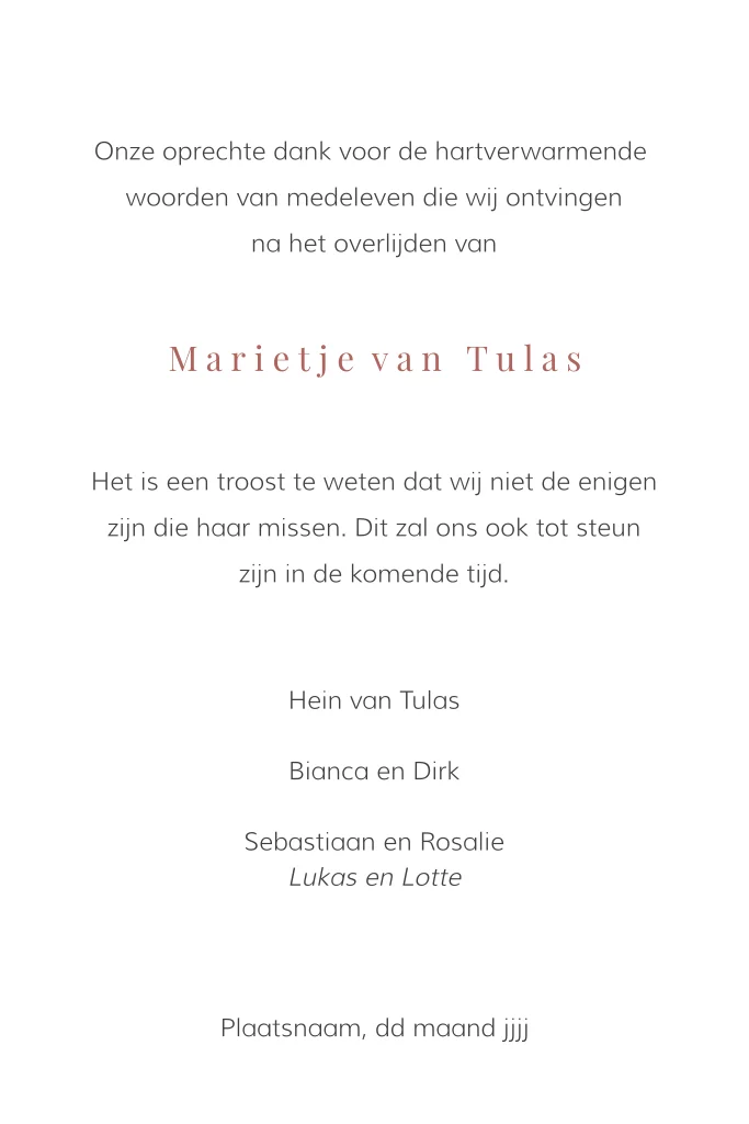 Met een dankbetuiging kun je familieleden en vrienden bedanken voor alle steun na het overlijden van jullie dierbare.