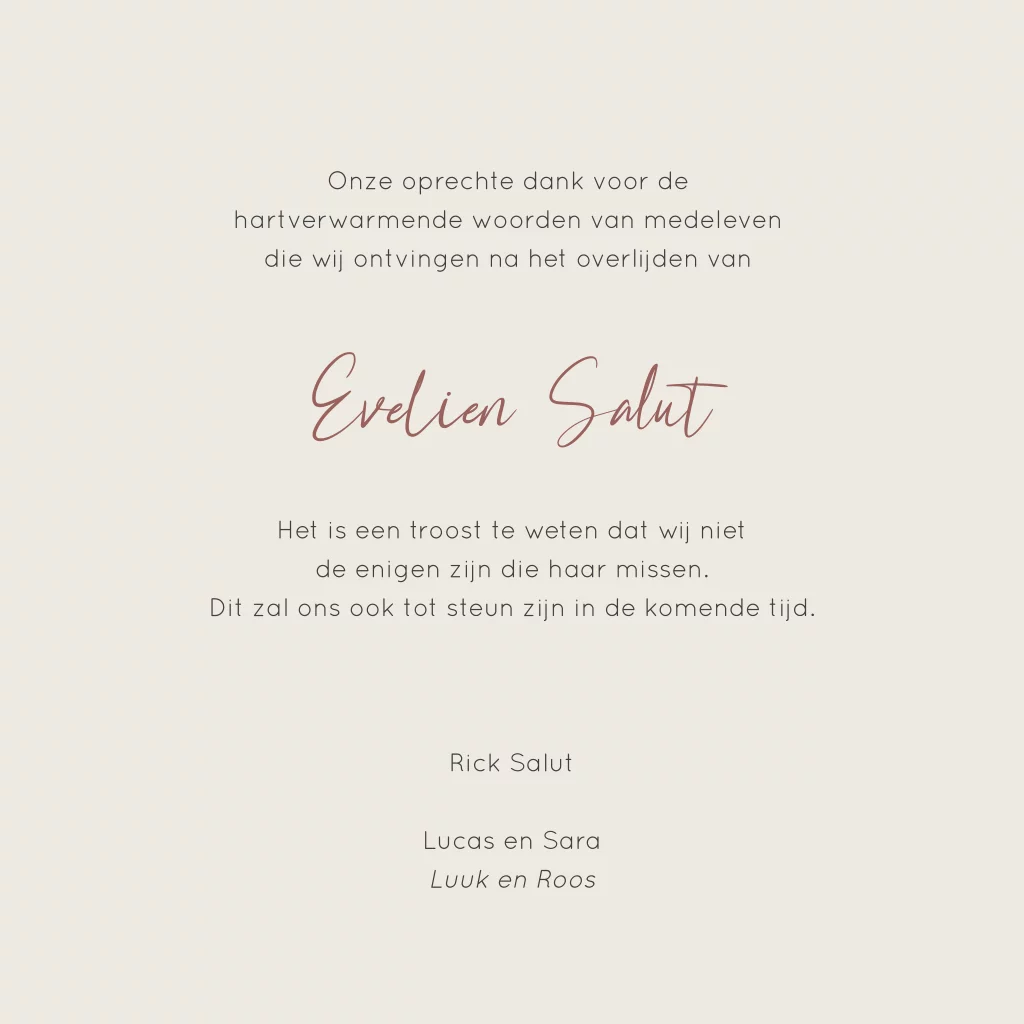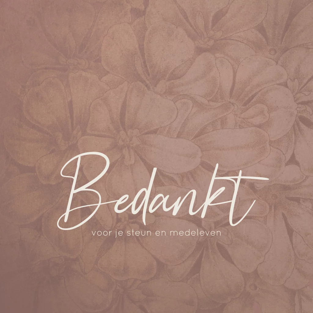 Stijlvolle aubergine kleurige bedankkaart met bloemige achtergrond. Met sierlijke letter staat er bedankt op de kaart.