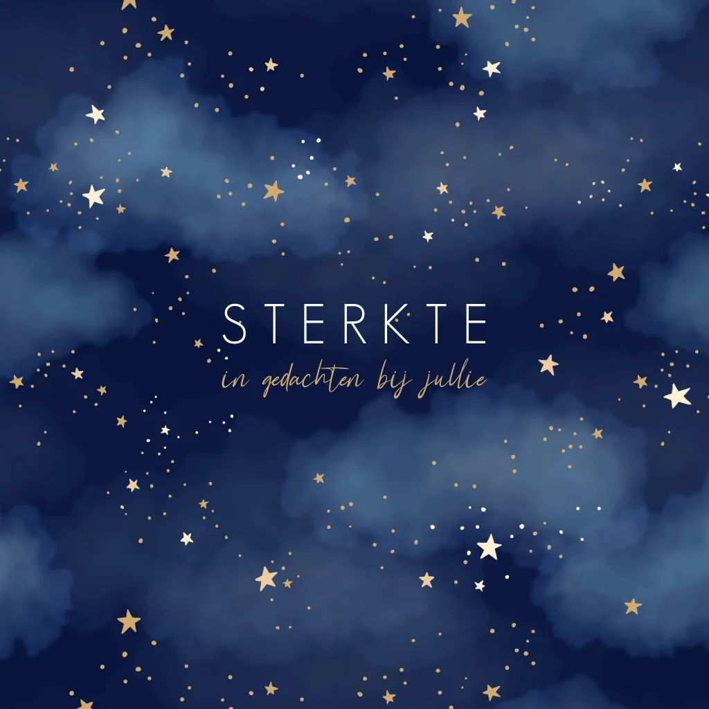 Condoleance kaart voor een baby of kind. Op deze sterkte kaart een blauwe hemel, met vele gouden sterretjes in de wolken.