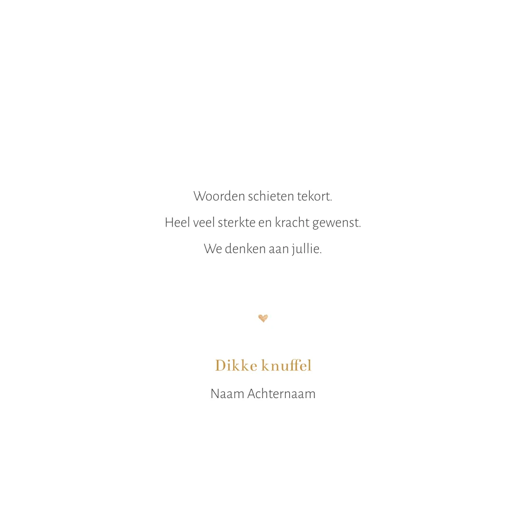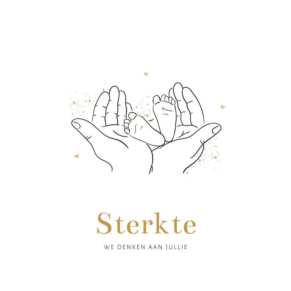 Cleane sterkte kaart met een online illustratie van handen met daarin baby voetjes. Rondom deze tekening gouden hartjes en spetters.
