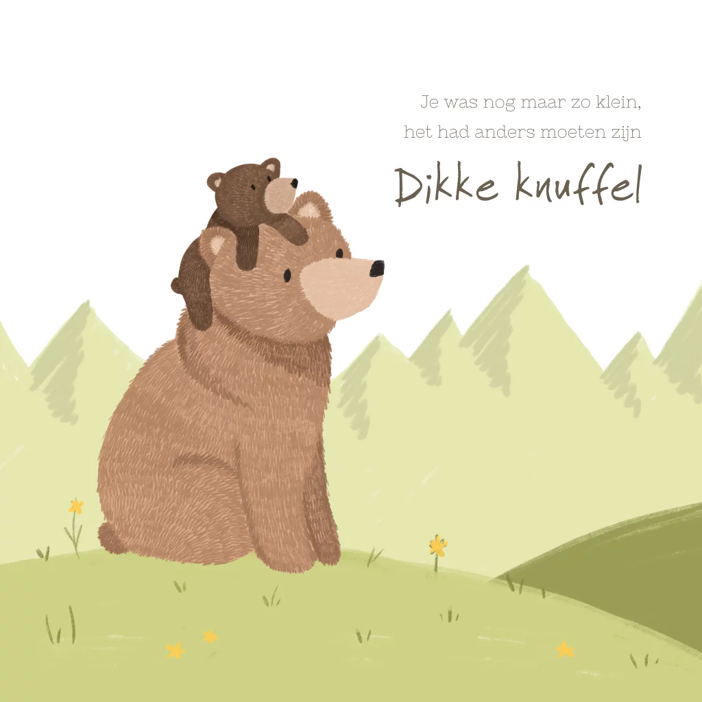 Condoleance kaart met getekende beer en haar jong. Op de achtergrond zie je bergen.
