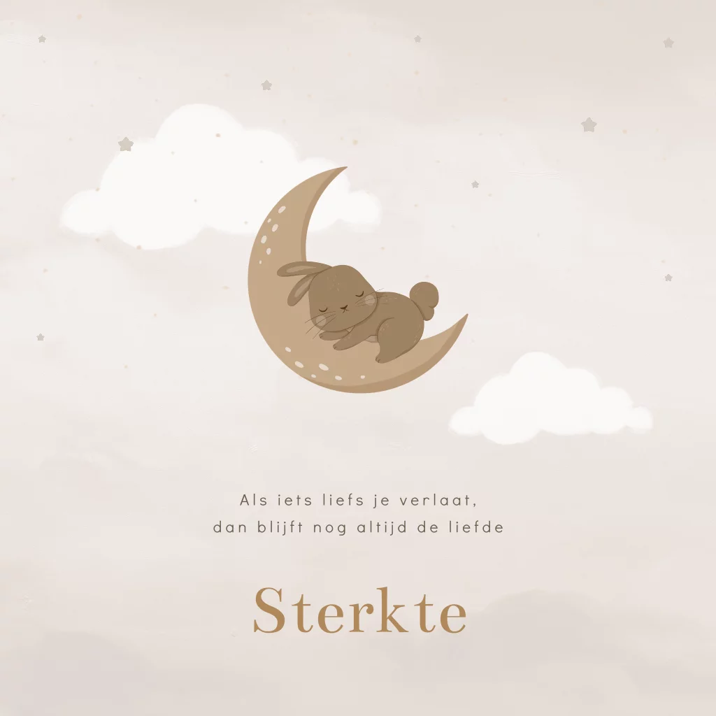 Kind sterkte kaart met een konijntje op een maan met wolken en sterren op de achtergrond. Deze condoleance kaart heeft beige naturel kleuren waardoor deze genderneutraal is en geschikt is voor een baby jongen of meisje.