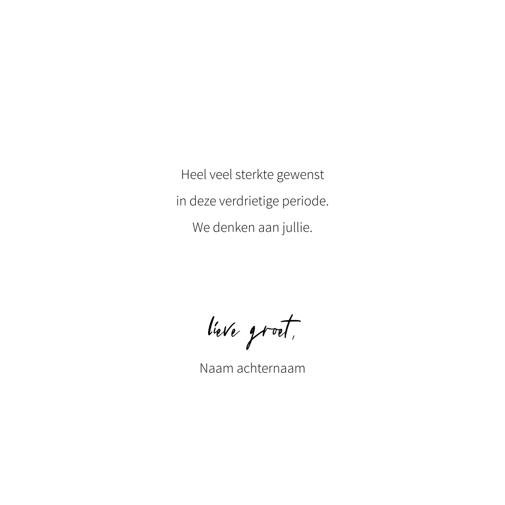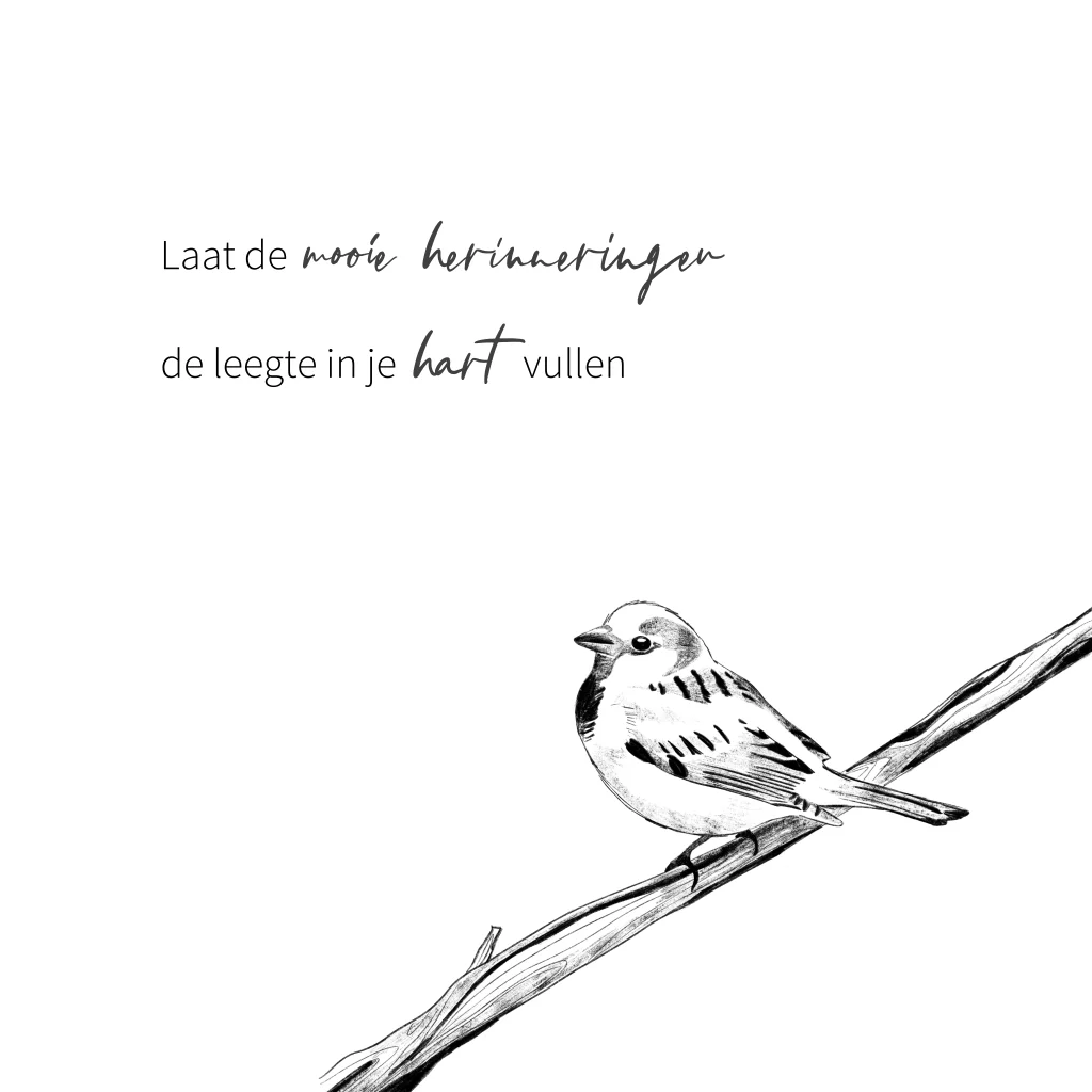 Cleane zwart-wit condoleance kaart met getekende vogel op een tak.