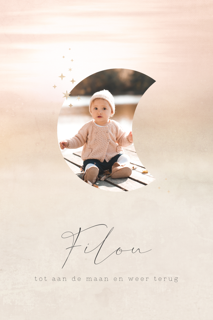 Gedachteniskaartje voor een baby of kind met een foto in de vorm van een maan. Op de achtergrond aquarel in roze tinten en kleine goudkleurige sterretjes.