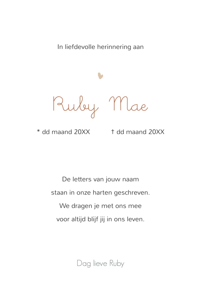 Op dit kaartje, ter nagedachtenis aan het kindje, is ruimte voor een foto, een mooi gedicht en een persoonlijke tekst om jullie kleintje te herinneren.