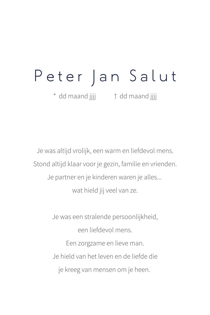 Op dit kaartje, ter nagedachtenis aan de overledene, is ruimte voor een foto, een mooi gedicht en een persoonlijke tekst om de dierbare te herinneren.