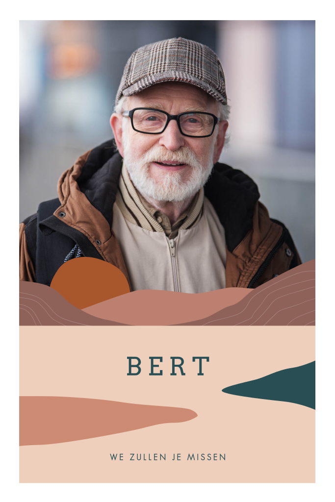 Gedachteniskaartje met foto en landschap van abstracte heuvels en zon.