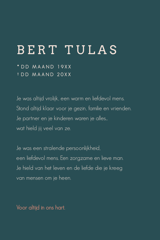 Op dit kaartje, ter nagedachtenis aan de overledene, is ruimte voor een foto, een mooi gedicht en een persoonlijke tekst om de dierbare te herinneren.