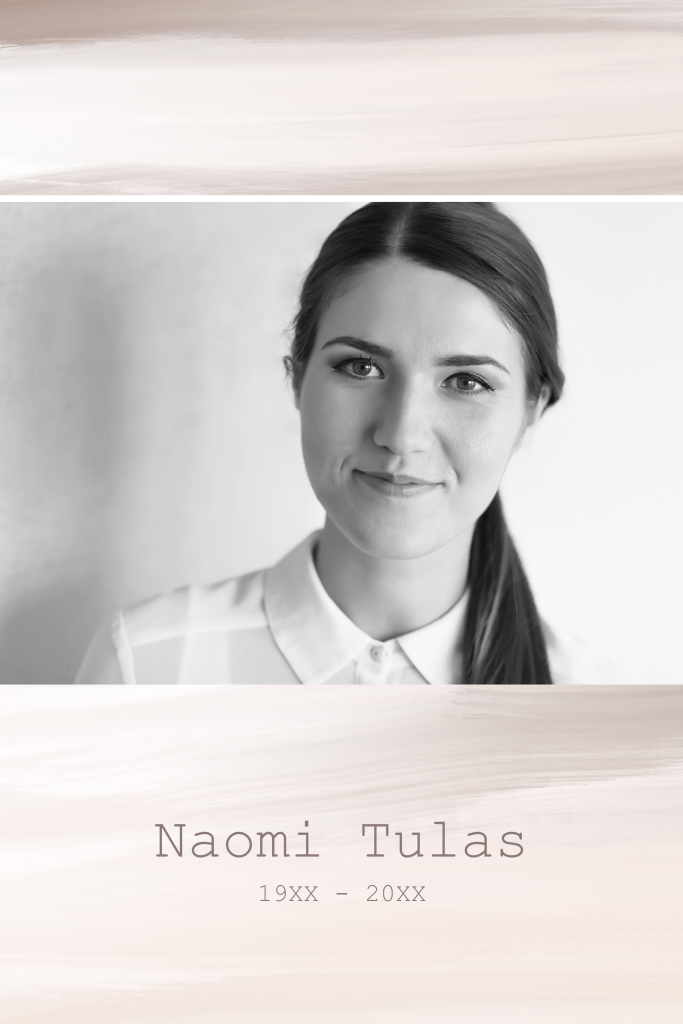 Modern gedachteniskaartje met foto en op de achtergrond verfstrepen in zacht roze tinten.