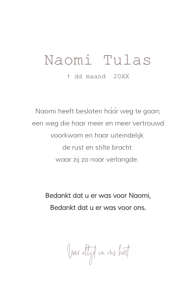 Op dit kaartje, ter nagedachtenis aan de overledene, is ruimte voor een foto, een mooi gedicht en een persoonlijke tekst om de dierbare te herinneren.