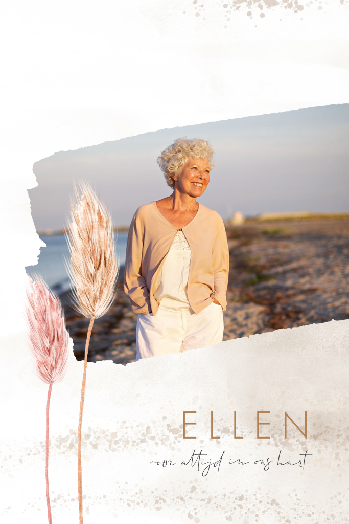 Kaartje ter nagedachtenis met een foto in een speels kader en mooie gedroogde pampas grassen in zachte kleuren.