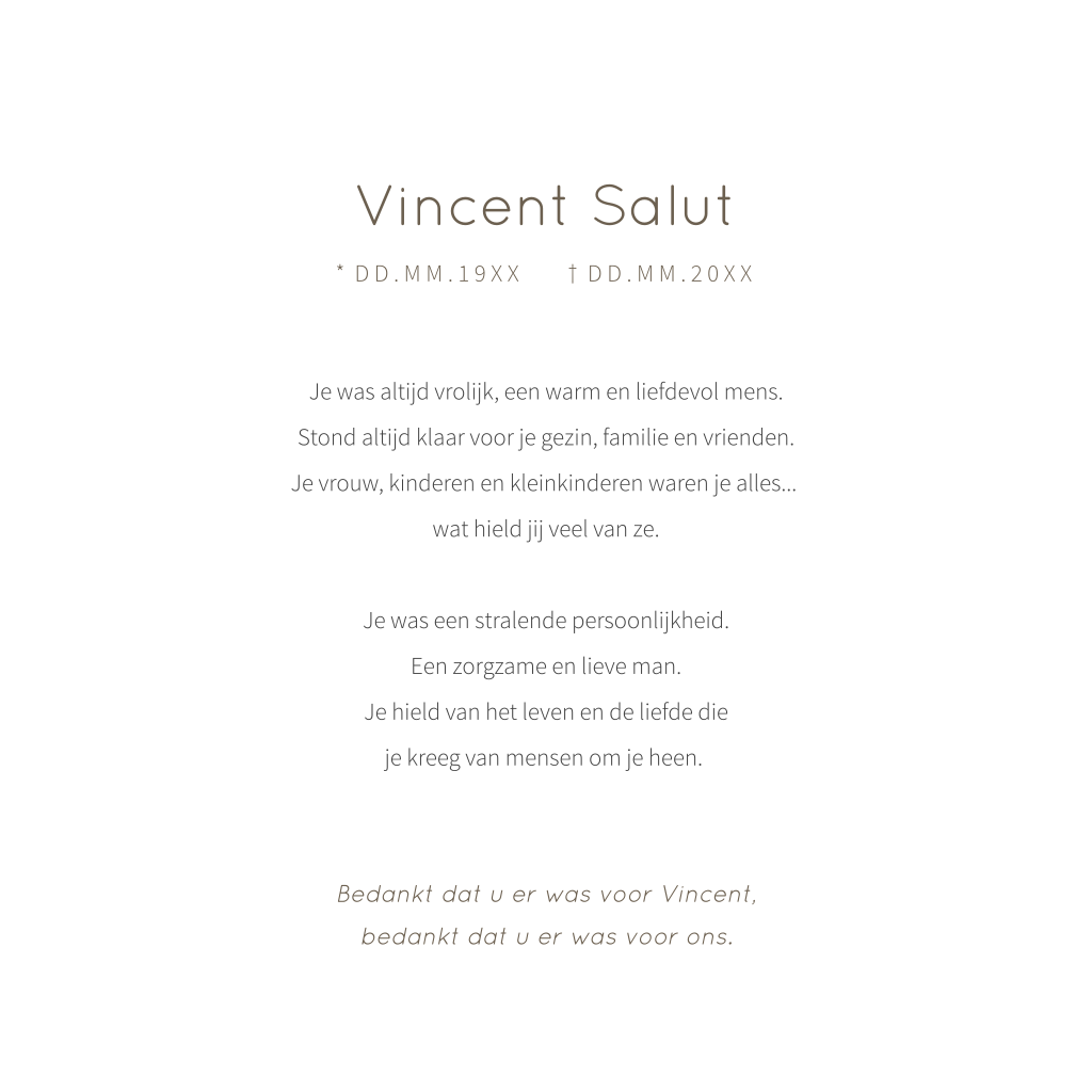 Op dit kaartje, ter nagedachtenis aan de overledene, is ruimte voor een foto, een mooi gedicht en een persoonlijke tekst om de dierbare te herinneren.