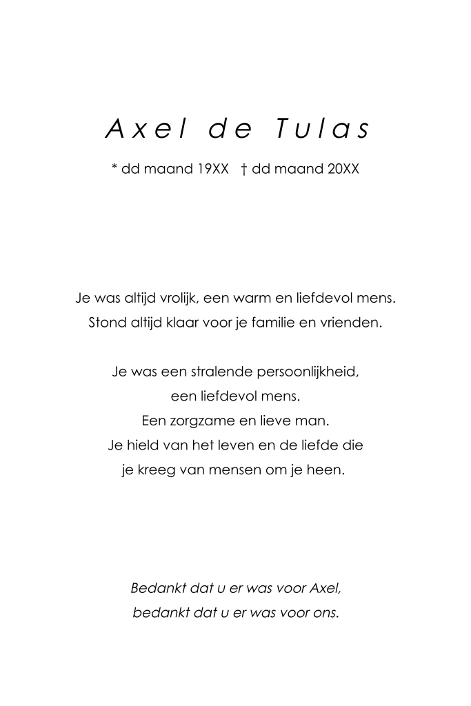 Op dit kaartje, ter nagedachtenis aan de overledene, is ruimte voor een mooi gedicht en een persoonlijke tekst om de dierbare te herinneren.