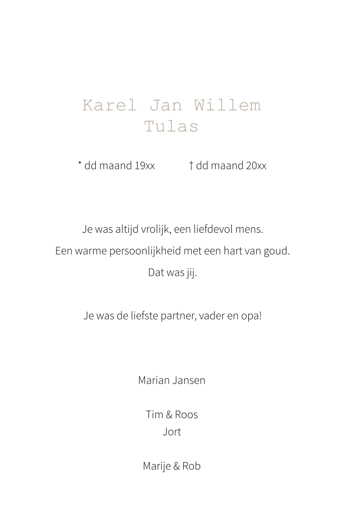 Op dit kaartje, ter nagedachtenis aan de overledene, is ruimte voor een foto, een mooi gedicht en een persoonlijke tekst om de dierbare te herinneren.