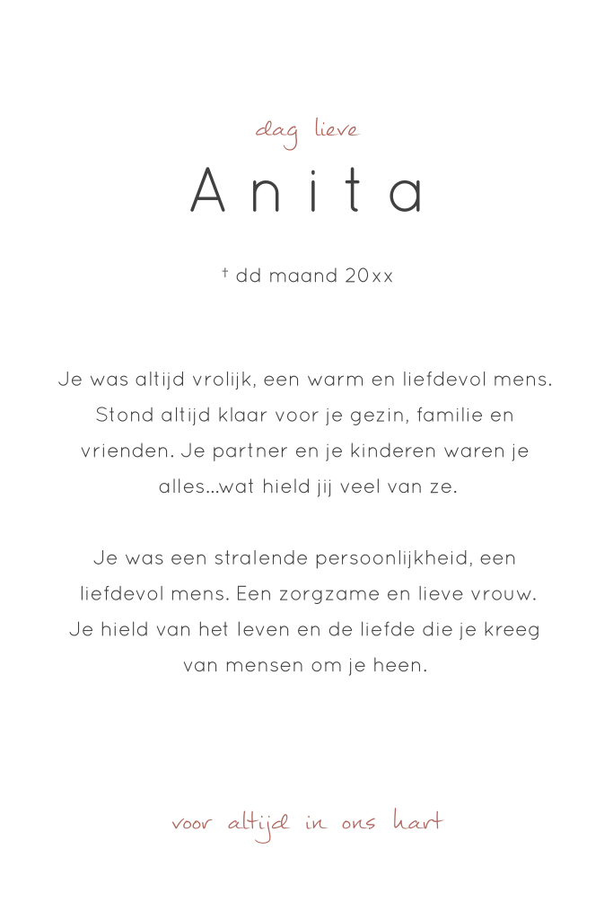 Op dit kaartje, ter nagedachtenis aan de overledene, is ruimte voor een foto, een mooi gedicht en een persoonlijke tekst om de dierbare te herinneren.