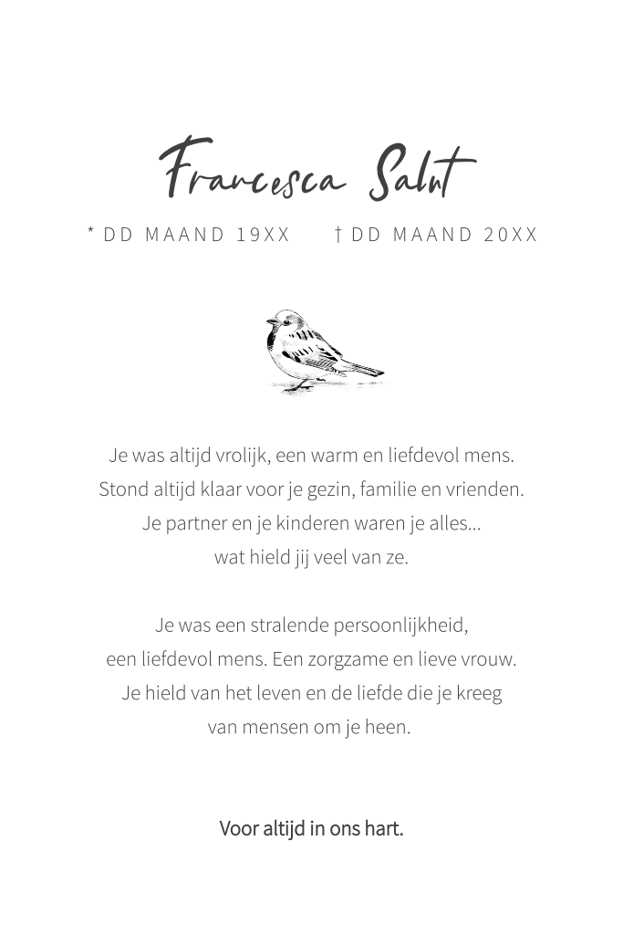 Op dit kaartje, ter nagedachtenis aan de overledene, is ruimte voor een foto, een mooi gedicht en een persoonlijke tekst om de dierbare te herinneren.