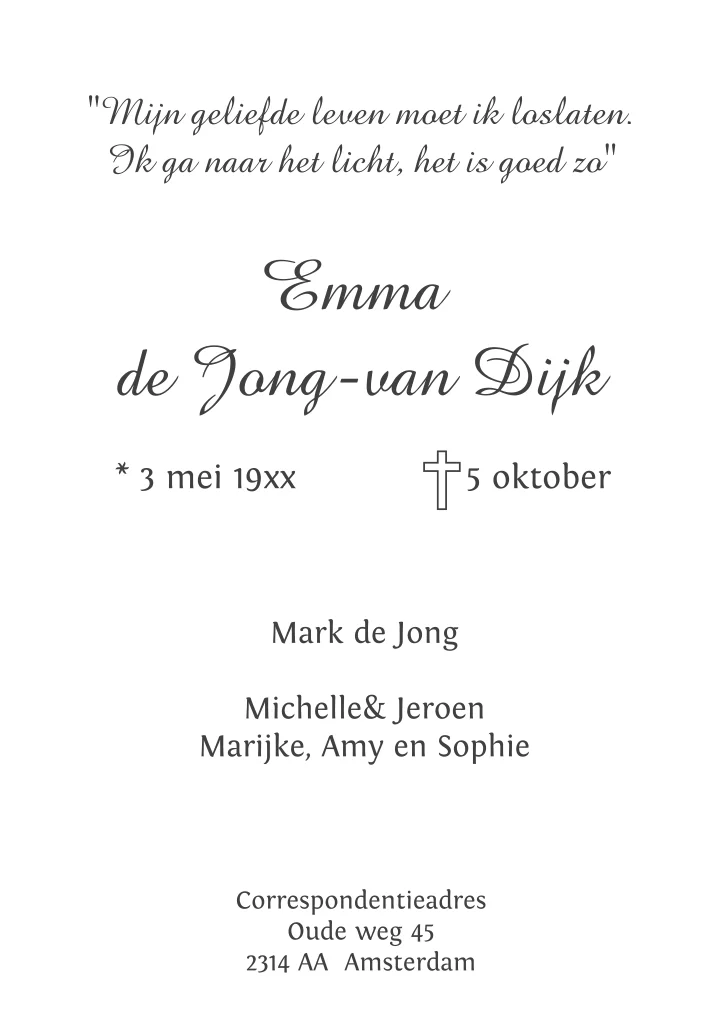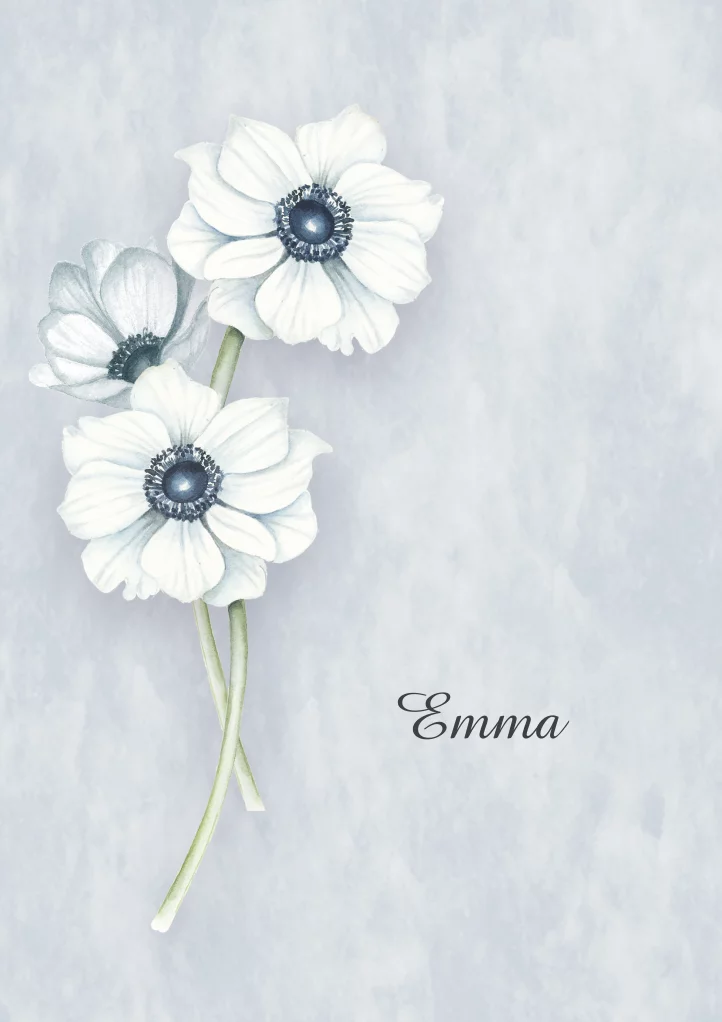 Mooi voorbeeld van rouwbrief met handgeschilderde witte anemonen.