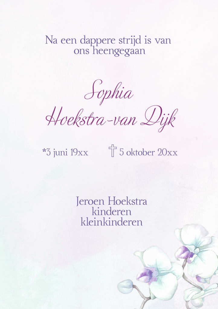 Kleurrijke rouwbrief met verschillende tinten paars en turquoise. Deze rouwbrief kan aangepast worden naar wens.