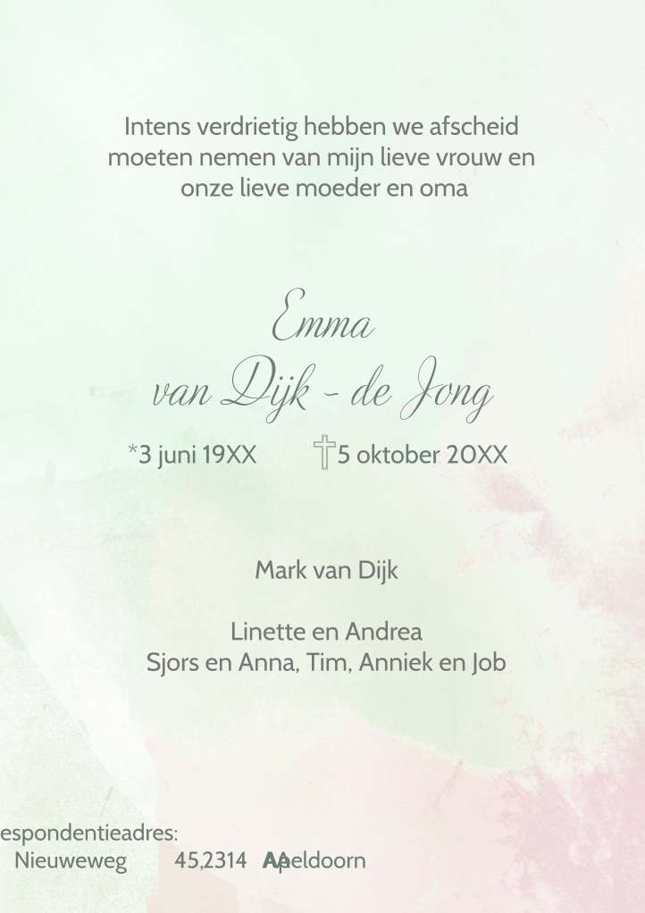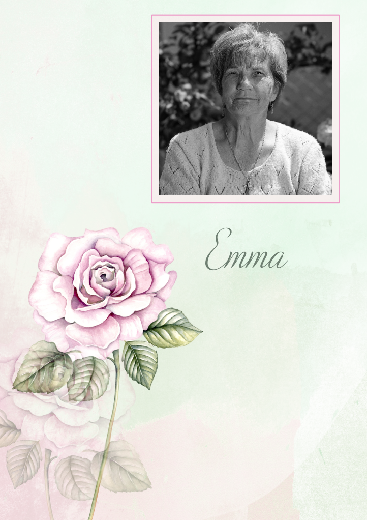 Rouwbrief met prachtige aquarel van een roze roos en een portretfoto aan de voorkant.