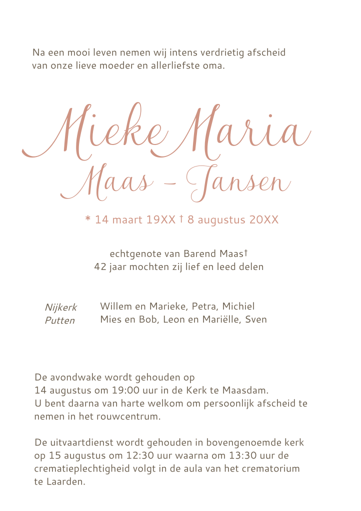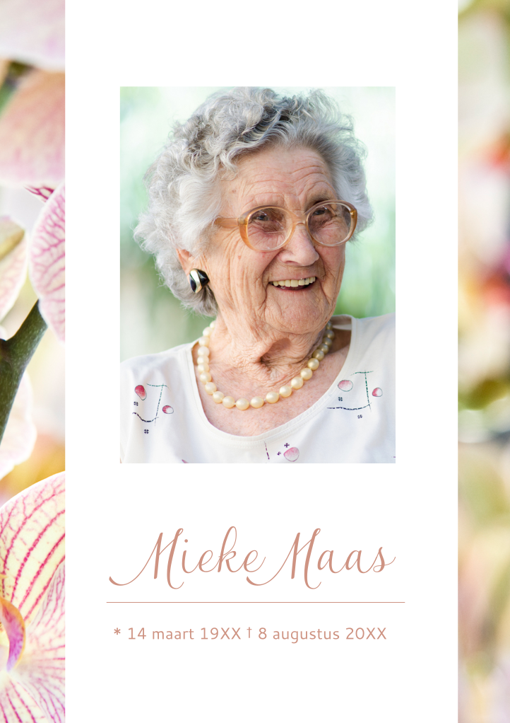 Rouwbrief met schitterende detailfoto van orchidee in roze, wit en geel.