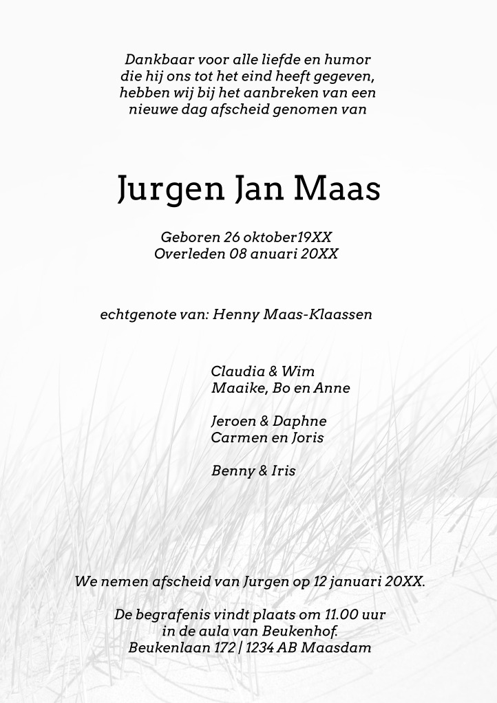 Rouwbrief met prachtige zwart-wit foto van duinenrand.