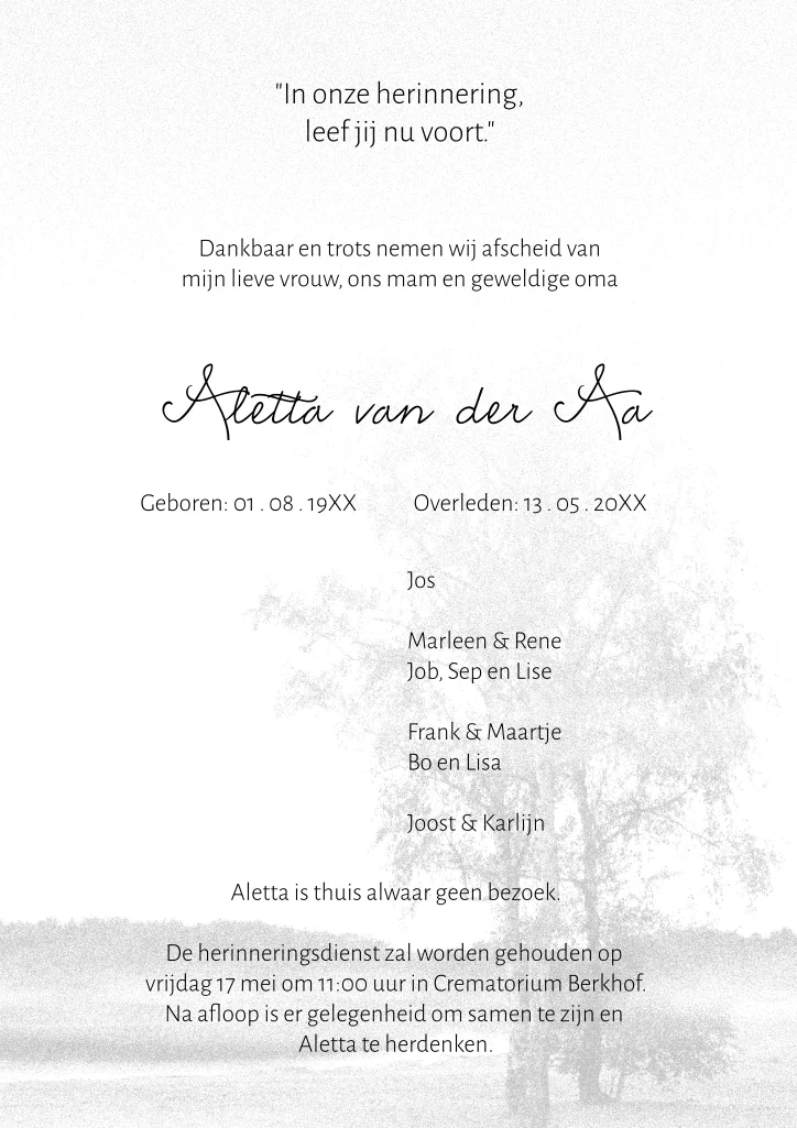 Rouwbrief met afbeelding van boom op de hei en bos in de verte.