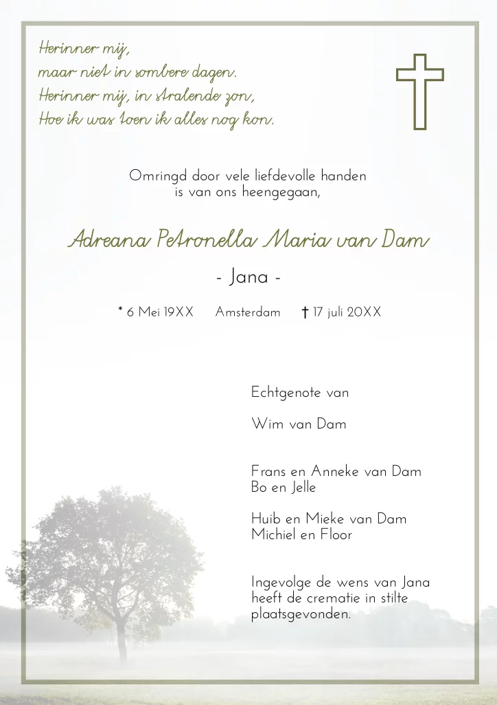 Sfeervolle rouwbrief met bos en heide. Pas de brief online aan naar smaak.