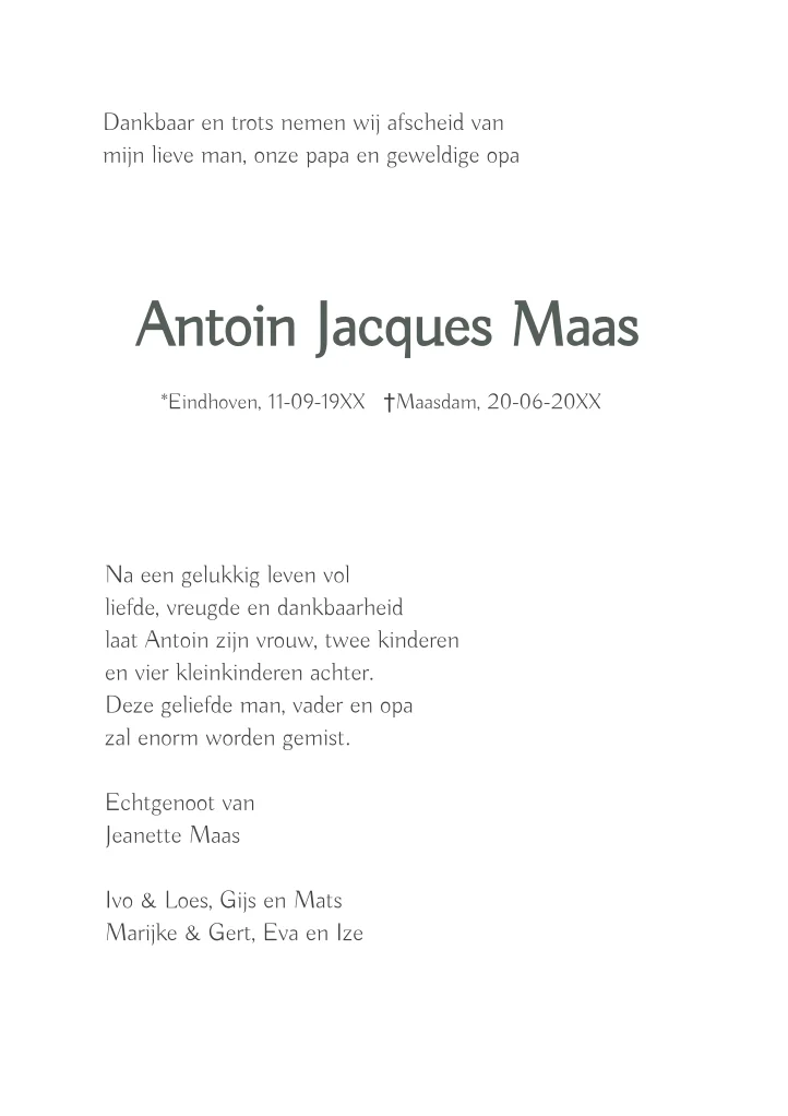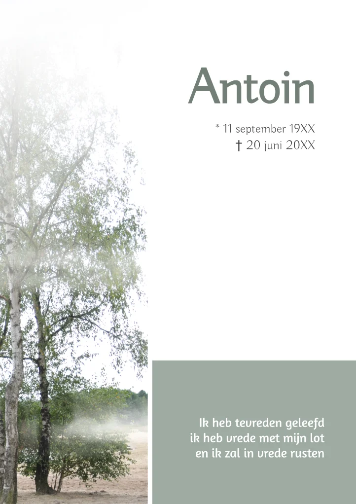 Mooie rouwbrief in wit en olijfgroen met sfeerfoto's van bomen.