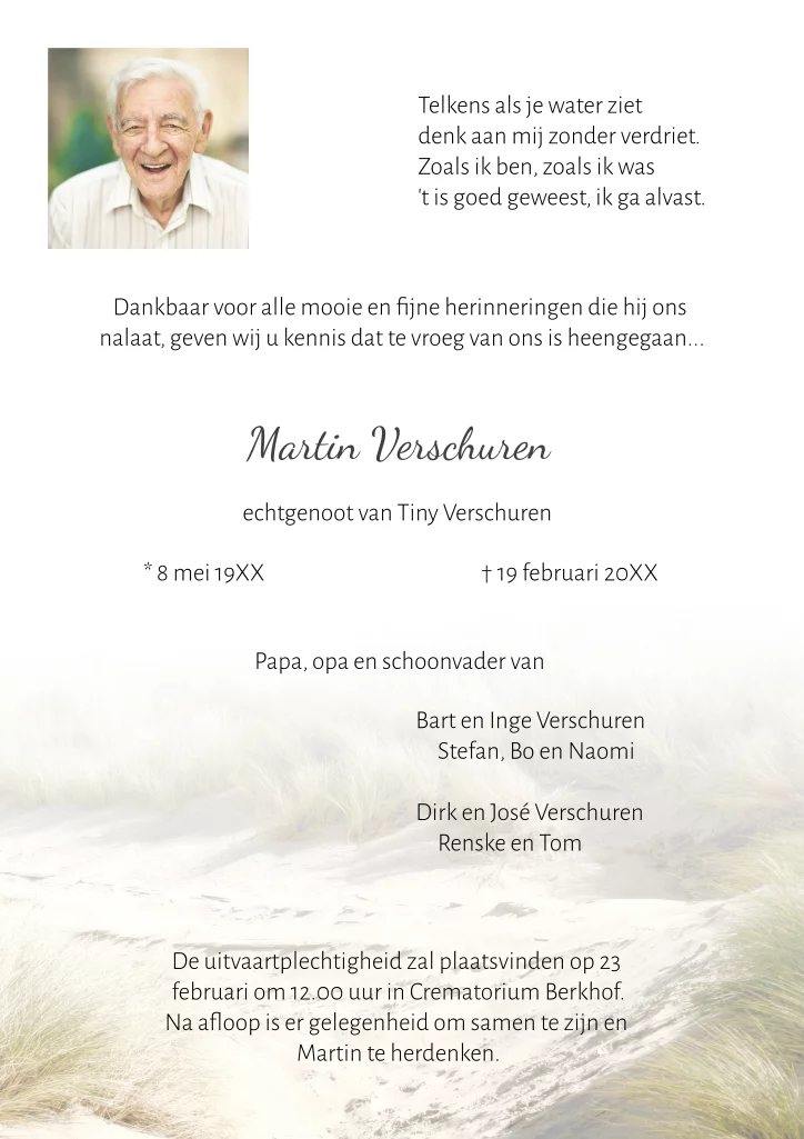 Rouwbrief met achtergrond van duinlandschap. Pad dit ontwerp aan naar wens.