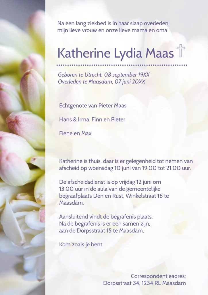Prachtige rouwbrief met achtergrond van hyacint bloemen.