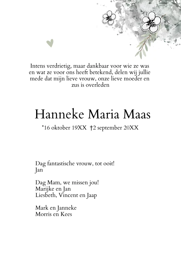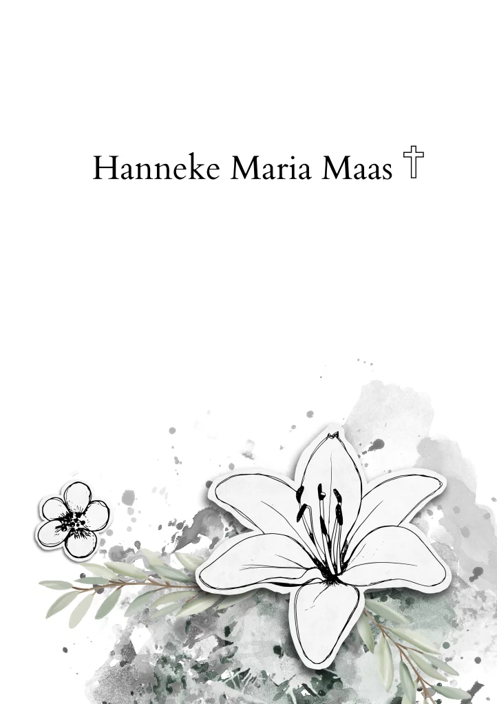 Originele rouwbrief met getekende lelie en waterverf accenten.
