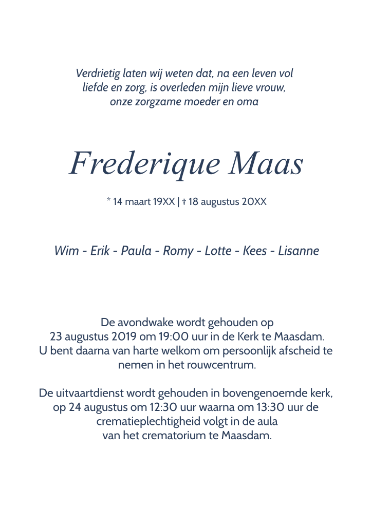 EIgentijds ontwerp van een rouwbrief met orchidee en deels blauwe achtergrond.