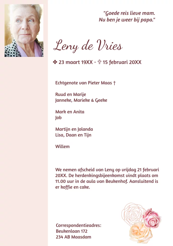 Stijlvolle rouwbrief voor vrouw met rozenknoppen.